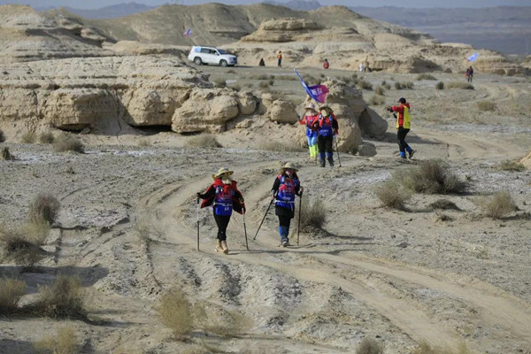 第一天是8小時(shí)25公里,牛商們在太陽還沒完全升起來就開始了遠(yuǎn)征前的熱身,原力專業(yè)的教練,激昂的樂章,鼓舞著雄心勃勃的牛商們,一聲號(hào)令全體出發(fā),萬馬奔騰的節(jié)奏開始了,彩旗飄飄,紅裝戰(zhàn)衣,藍(lán)色背包,熒光粉的名號(hào)牌,浩浩蕩蕩,塵土飛揚(yáng)!戈壁我們來了!