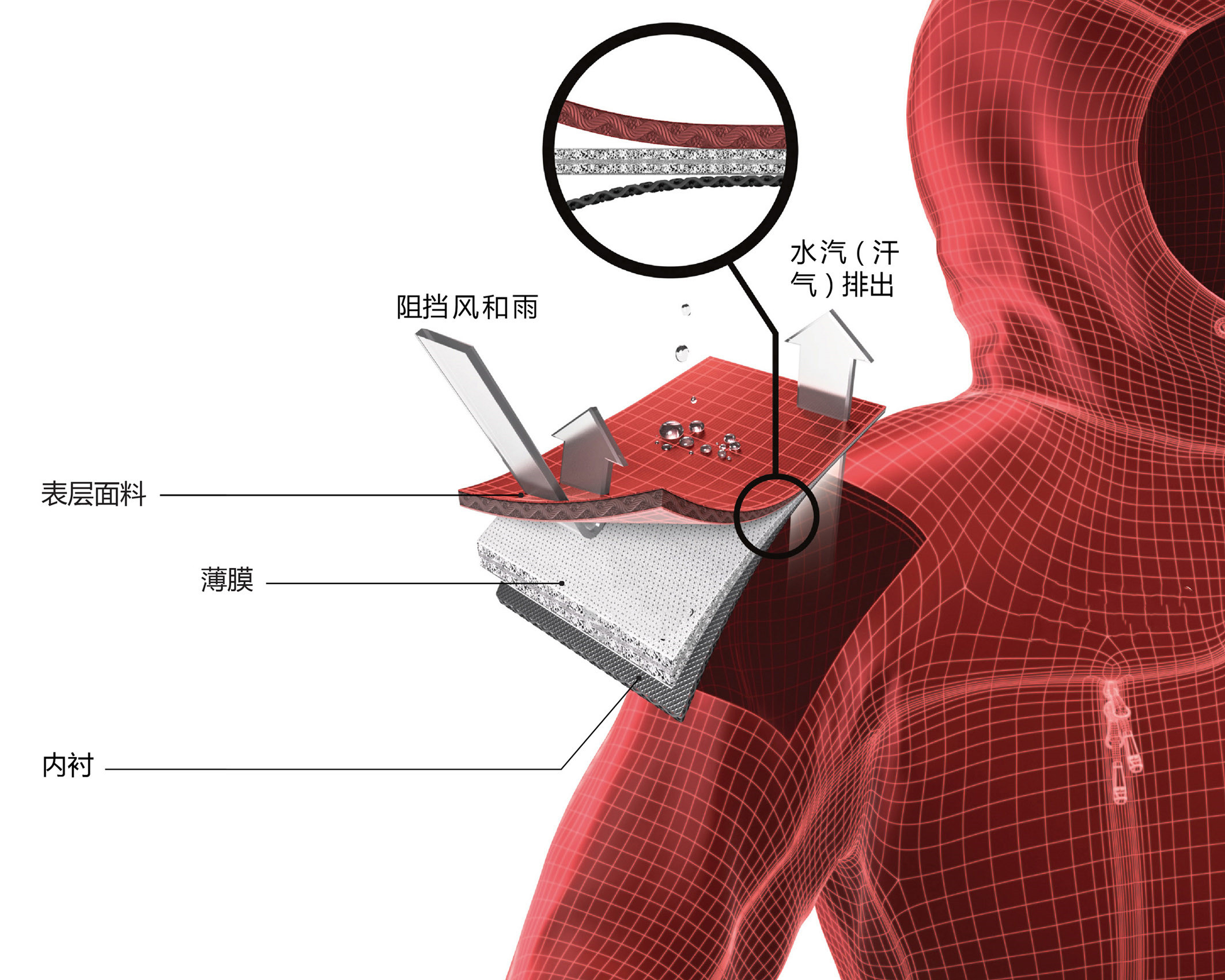 3、兩層半面料:復(fù)合防水透氣層,再加一層保護(hù)層(不是襯布),制作服裝生產(chǎn)加工過程中不需要添加襯里,因為已經(jīng)有了保護(hù)層,但它比三層壓膠面料輕薄柔軟得多。