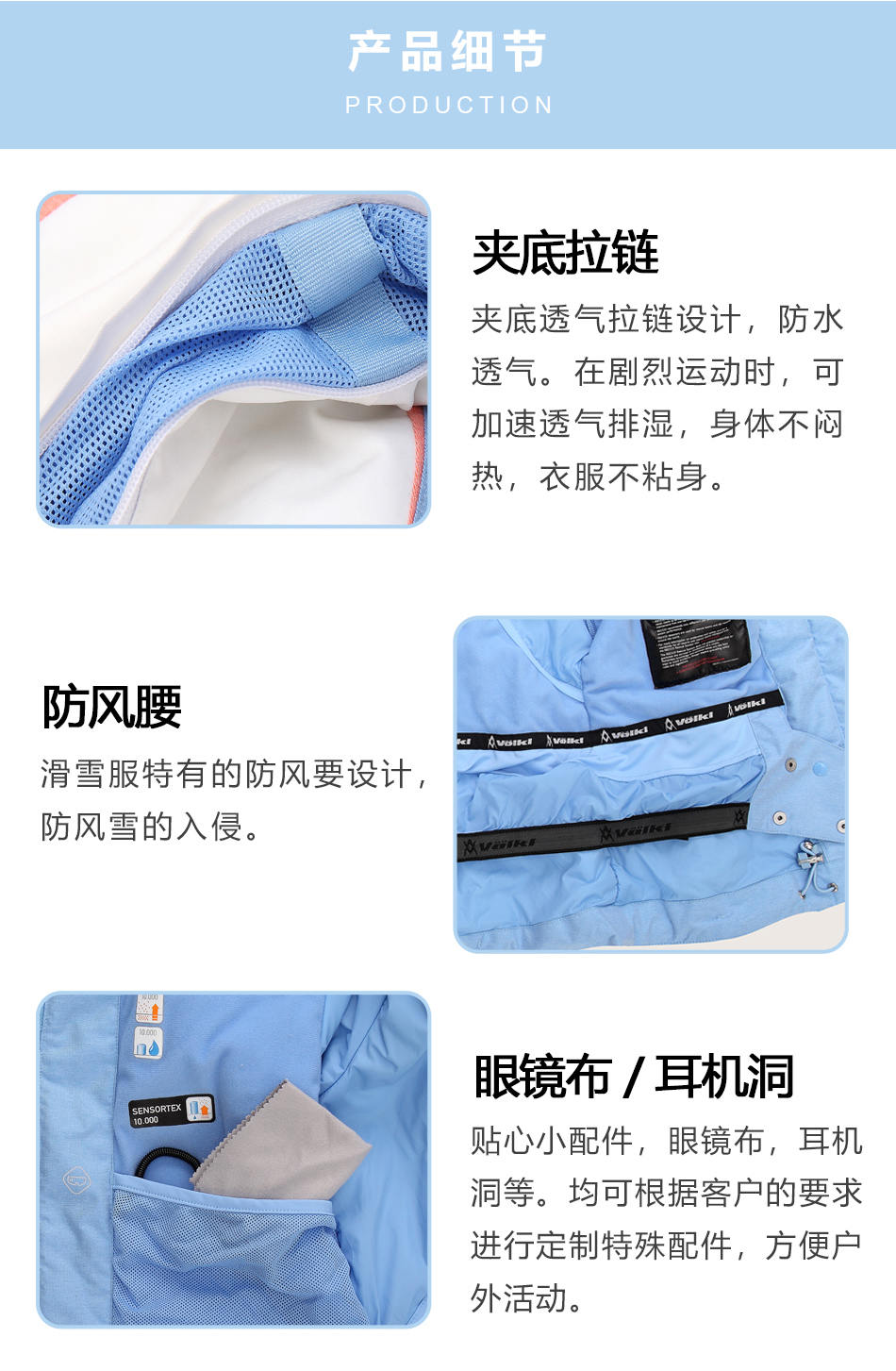 • 防水拉鏈采用無縫壓膠防水拉鏈激光熱封工藝貼合,面料采用進口防水透氣涂層膜,使防水透氣膜與面料完美結合。可根據客戶需求完成戶外沖鋒衣定制。