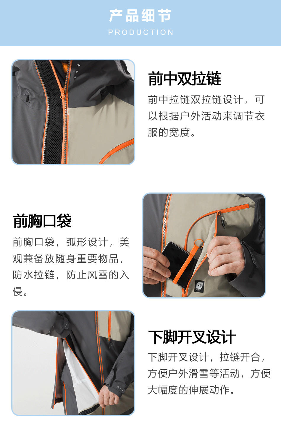 【前中雙拉鏈】前中雙拉鏈設計,可以根據戶外活動調節衣服的寬度